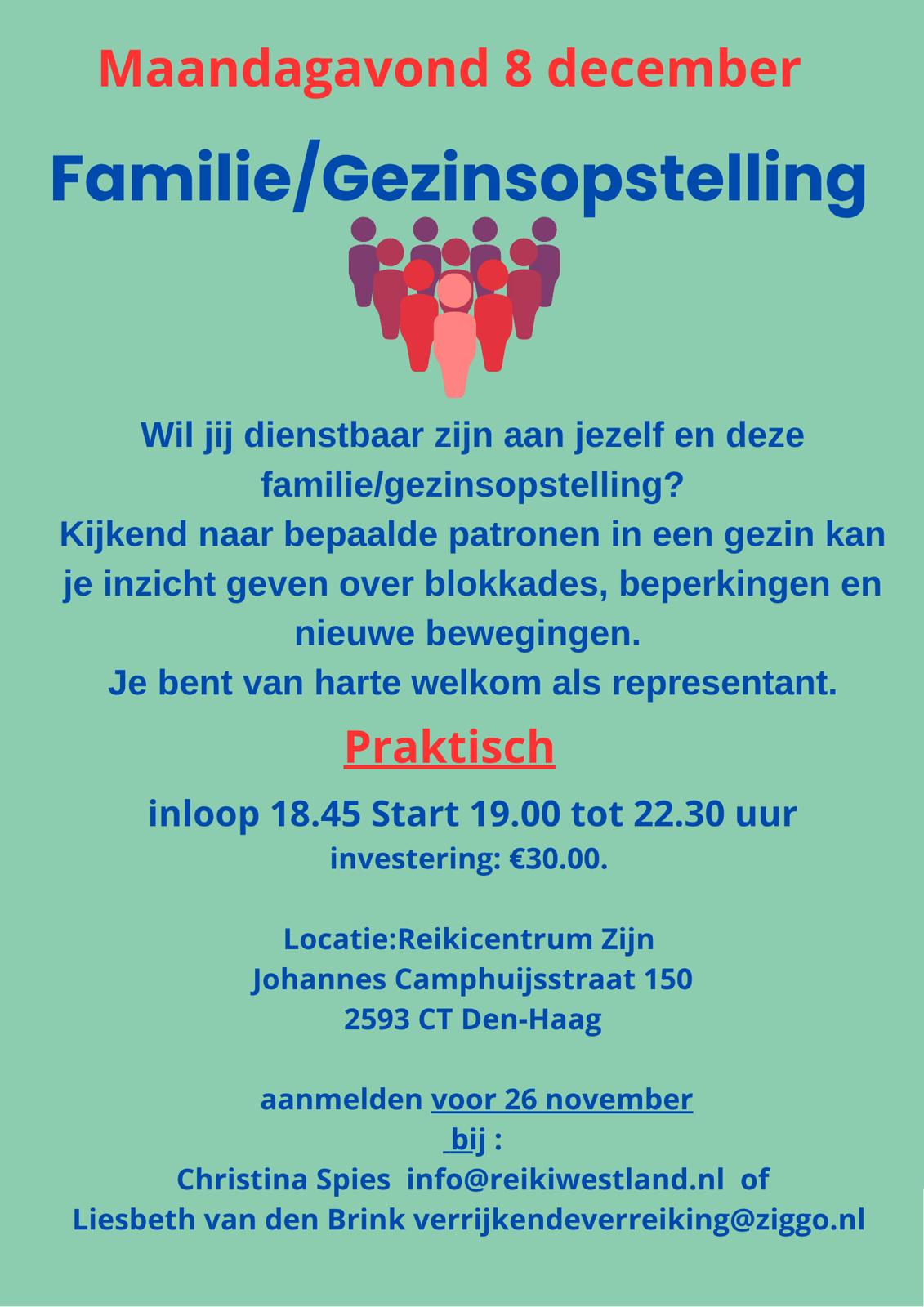 | Info bij en opgeven bij: | Opstellingenbegeleiders Christina Spies info@reikiwestland.nl of Liesbeth van den Brink info@verrijkendeverreiking.nl |